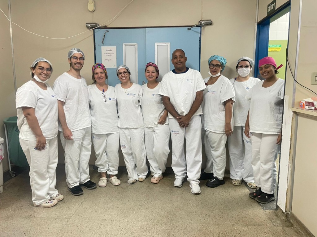 A imagem mostra um grupo de servidores posicionados para a foto em frente ao centro cirúrgico do Pronto-Socorro de Cuiabá. Todos utilizam roupas adequadas para o ambiente hospitalar.