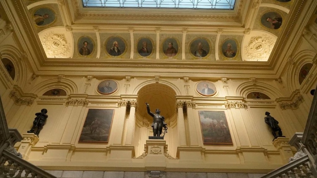 Entre essas peças, no teto da escadaria principal, há 18 pinturas que circundam a claraboia do salão em uma sanca. Nelas, estão retratados 18 brasileiros que deixaram seu legado na luta pela independência do país. Mas quem são eles?