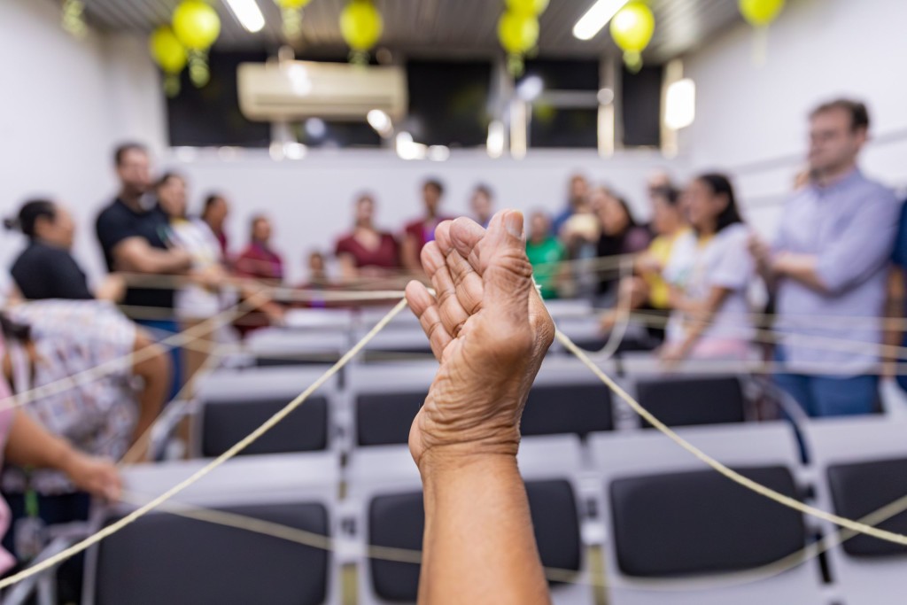 Médicos, enfermeiros, psicólogos e técnicos participaram da atividade “Teia da Solidariedade”, na qual os participantes formaram um círculo, seguraram um novelo de barbante, lançaram-no uns aos outros e, a cada jogada, compartilharam uma mensagem de apoio ou agradecimento, construindo uma rede de conexão e valorização da vida.