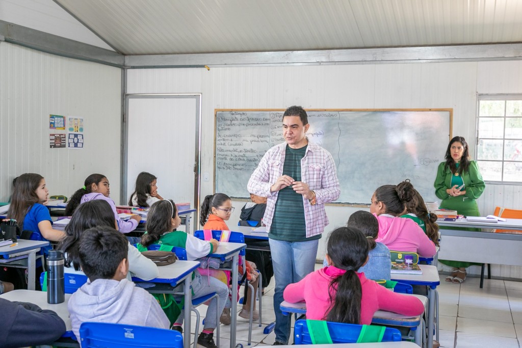 A foto ilustra crianças numa sala de aula, sentadas em cadeiras azuis e apoiadas em mesas cinzas. No centro, está o palestrante Edmilson Marques de Moraes. Trata-se de um homem de cor parda, cabelos pretos, vestido com camisa social xadrez e calça jeans. No fundo, é possível visualizar um quadro com ensinamentos e, do lado direito, uma mulher que veste roupa verde.