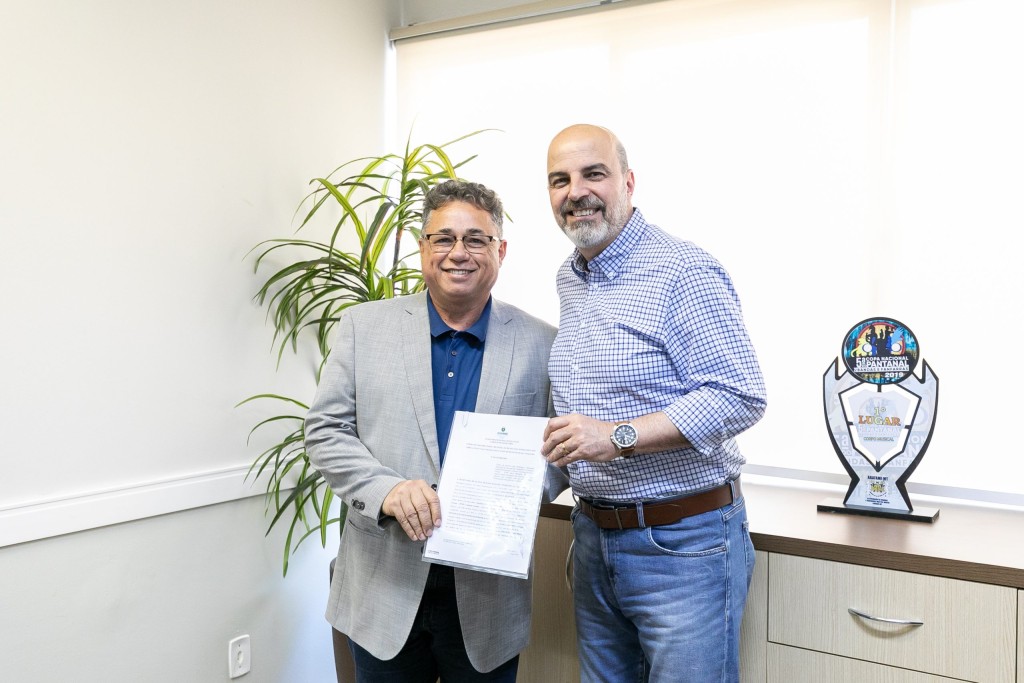 A foto mostra o secretário de Educação, Amauri Monge Fernandes, trajando roupa social, ao lado do diretor do IFMT, professor Alceu Cardoso. Ambos vestem trajes sociais e exibem o termo de parceria assinado entre o município e a instituição de ensino.