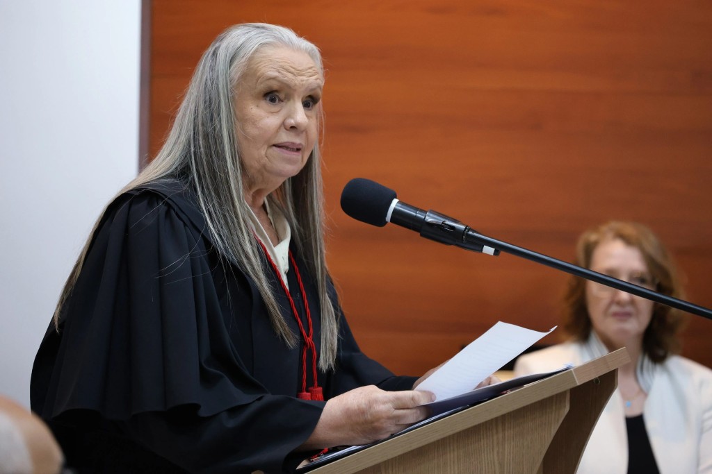Uma mulher de longos cabelos grisalhos e toga preta lê um documento em um púlpito de madeira. Ela fala ao microfone. Ao fundo, uma mulher de blazer branco observa.Mais 30 municípios de Mato Grosso receberão neste ano a instalação da Rede de Enfrentamento à Violência Doméstica e Familiar. A ação do Tribunal de Justiça de Mato Grosso (TJMT) já está presente em 100 cidades do estado, trabalhando na prevenção e combate aos casos de agressão contra mulheres.
