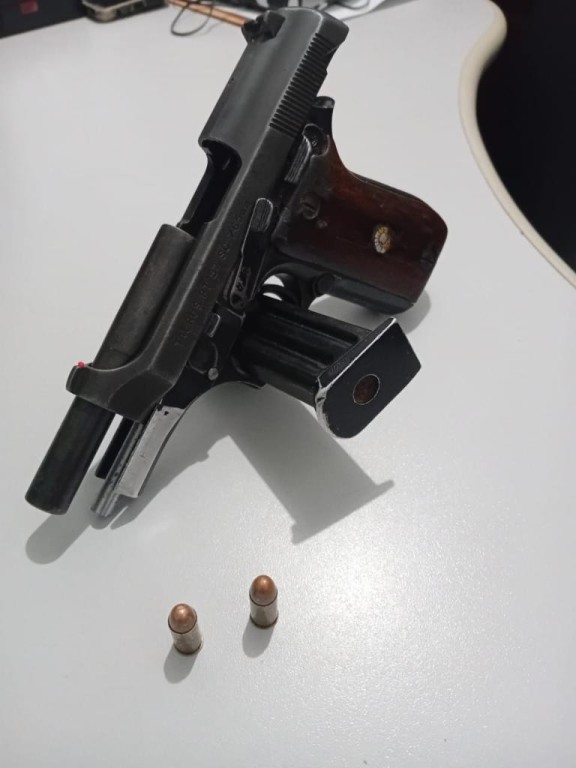 Com um dos suspeitos, a PM localizou a pistola e as munições. Ao ser perguntado sobre a procedência da arma, o homem não respondeu os questionamentos e disse apenas que estaria levando o objeto para um sítio.