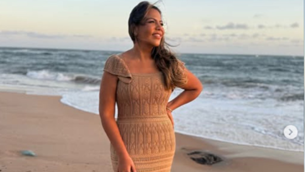 Em um dos cliques, ela surge admirando a paisagem, usando um vestido cor nude, de crochê. Em outro clique, ela aparece sorridente.