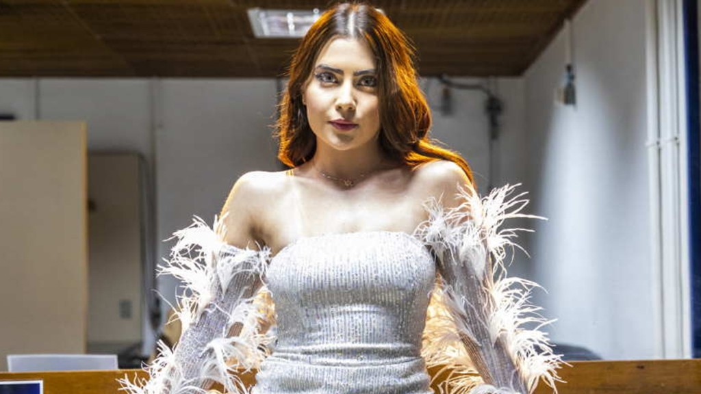 Nos cliques, a atriz capricha nas poses em que usa um vestido branco com detalhes. Ela ainda posou com convidados do programa.